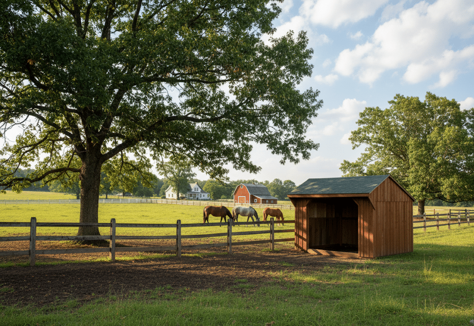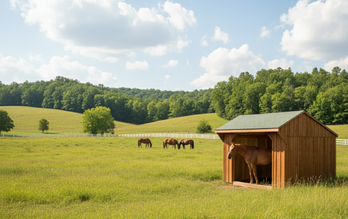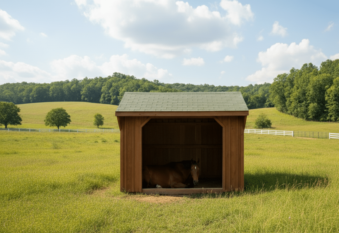 A run-in shed is the minimum requirement for responsible pasture management. It is typically a three-sided structure providing immediate, accessible shelter.