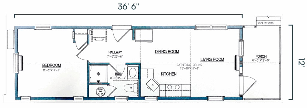 Dimensions: 12' × 42'6" Living Space: 390 sq ft Porch: 72 sq ft Bedrooms / Baths: Studio-style / 1 Bath Starting At: $94,452