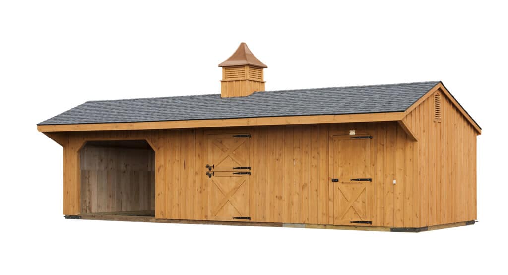 Every shed-row barn is custom-configured to your needs. Stall sizes can be 10×10, 10×12, 12×12, or custom dimensions. Mix and match stall sizes in the same barn—larger foaling stalls, standard riding horse stalls, and pony stalls all in one structure. We design the layout that works for your specific horses and operation.