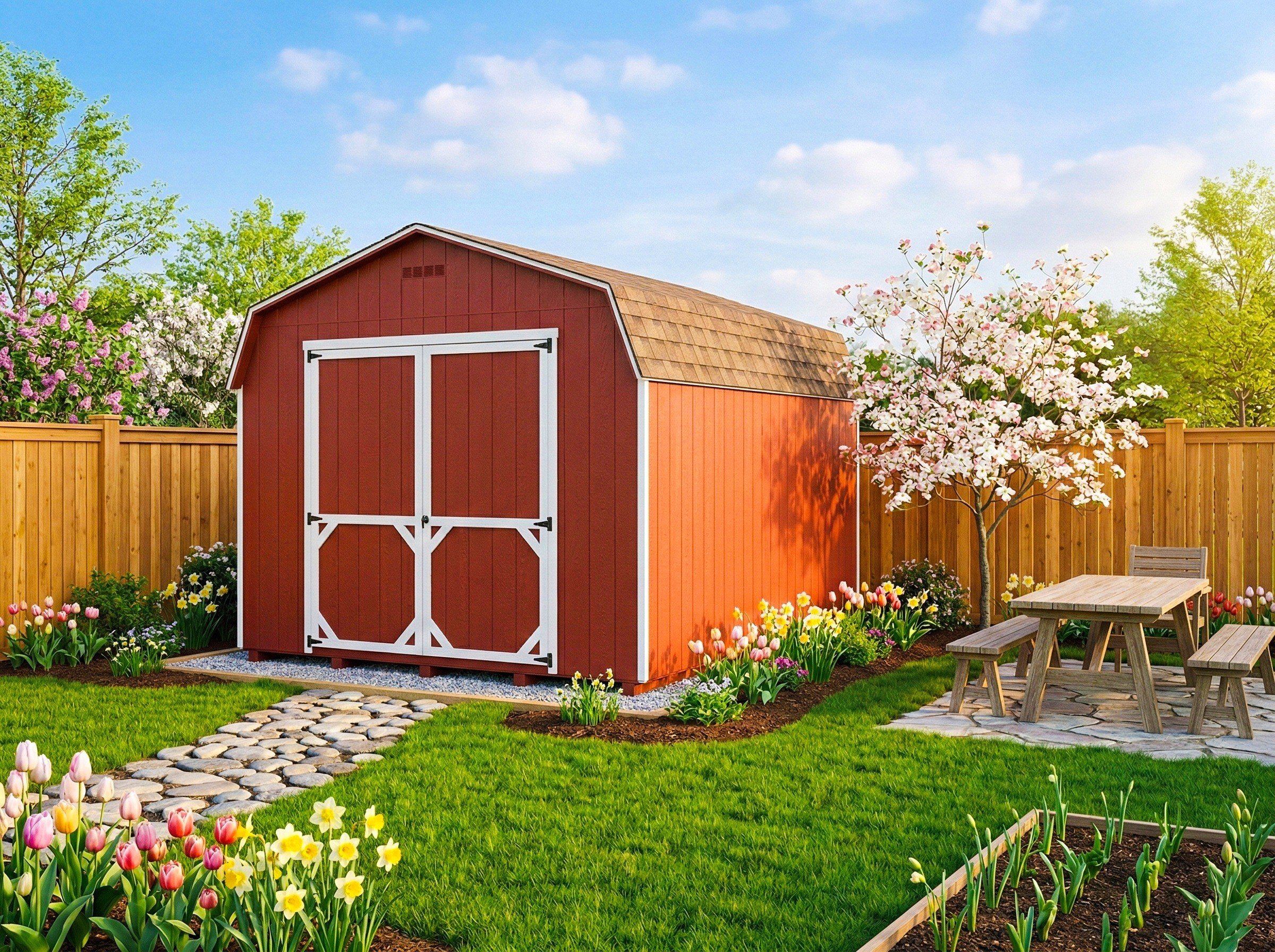 Showcasing the 10×12 Carolina Dutch shed (Model #2049S) with its bold red Smartside exterior, crisp white trim, and durable black shingled roof. The 5ft double doors make it easy to store larger equipment, and the barn-inspired design brings timeless appeal to any yard.
