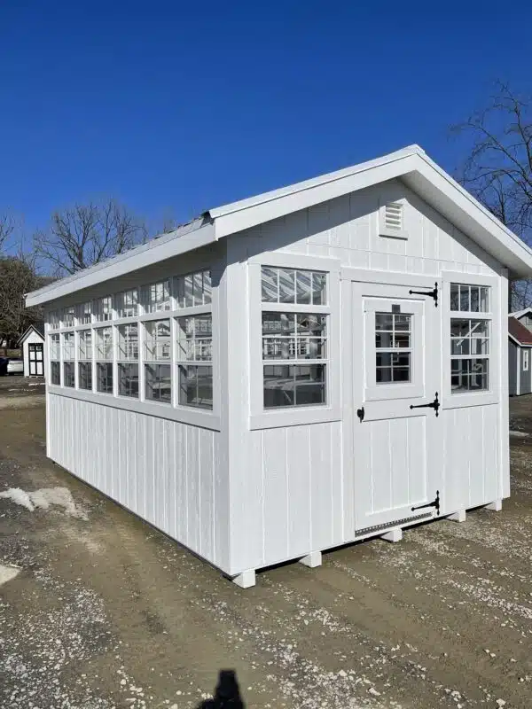 Transform your gardening experience with the 10×16 Classic Greenhouse, expertly finished in bright white and topped with a clear panel roof for unmatched sunlight exposure. This spacious greenhouse is designed for passionate gardeners and hobbyists, offering ample room for seed starting, vegetable growing, and nurturing delicate plants throughout the year. The wraparound windows and transparent roof panels flood the interior with natural light, creating the perfect environment for healthy, thriving plants.