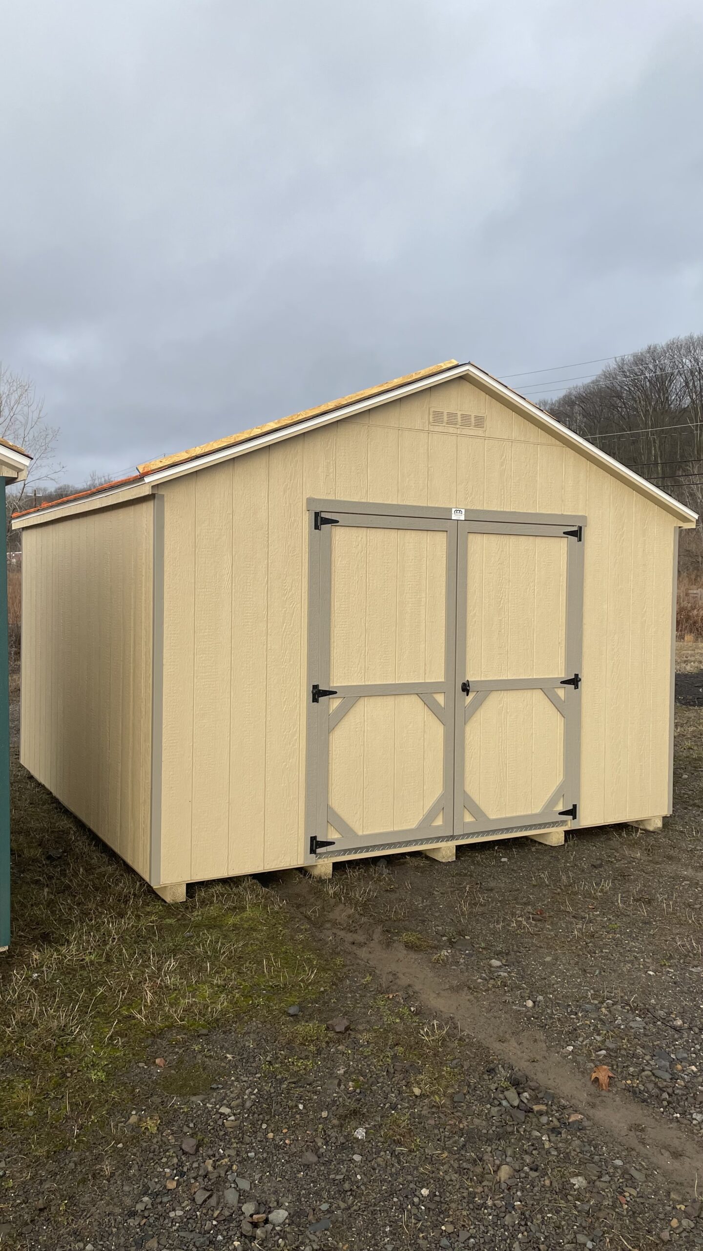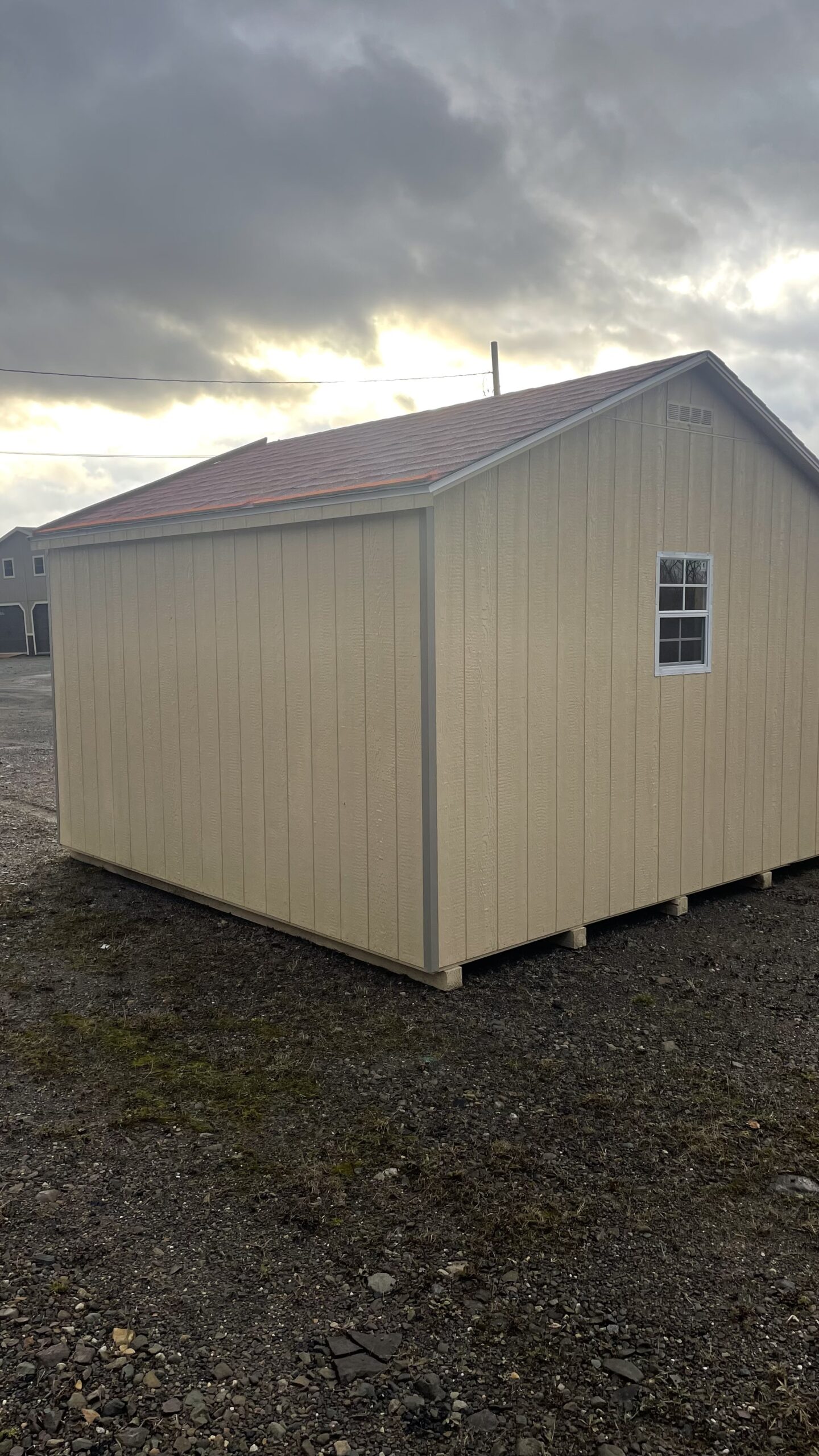 This model is shown in Stoltzfus Tan with GP Clay trim and a Harvard Slate roof, creating a neutral, versatile color combination that works well with many home and landscape styles. It features a 6×6 door for easy access and an 18×23 window that adds natural light and visual appeal.
