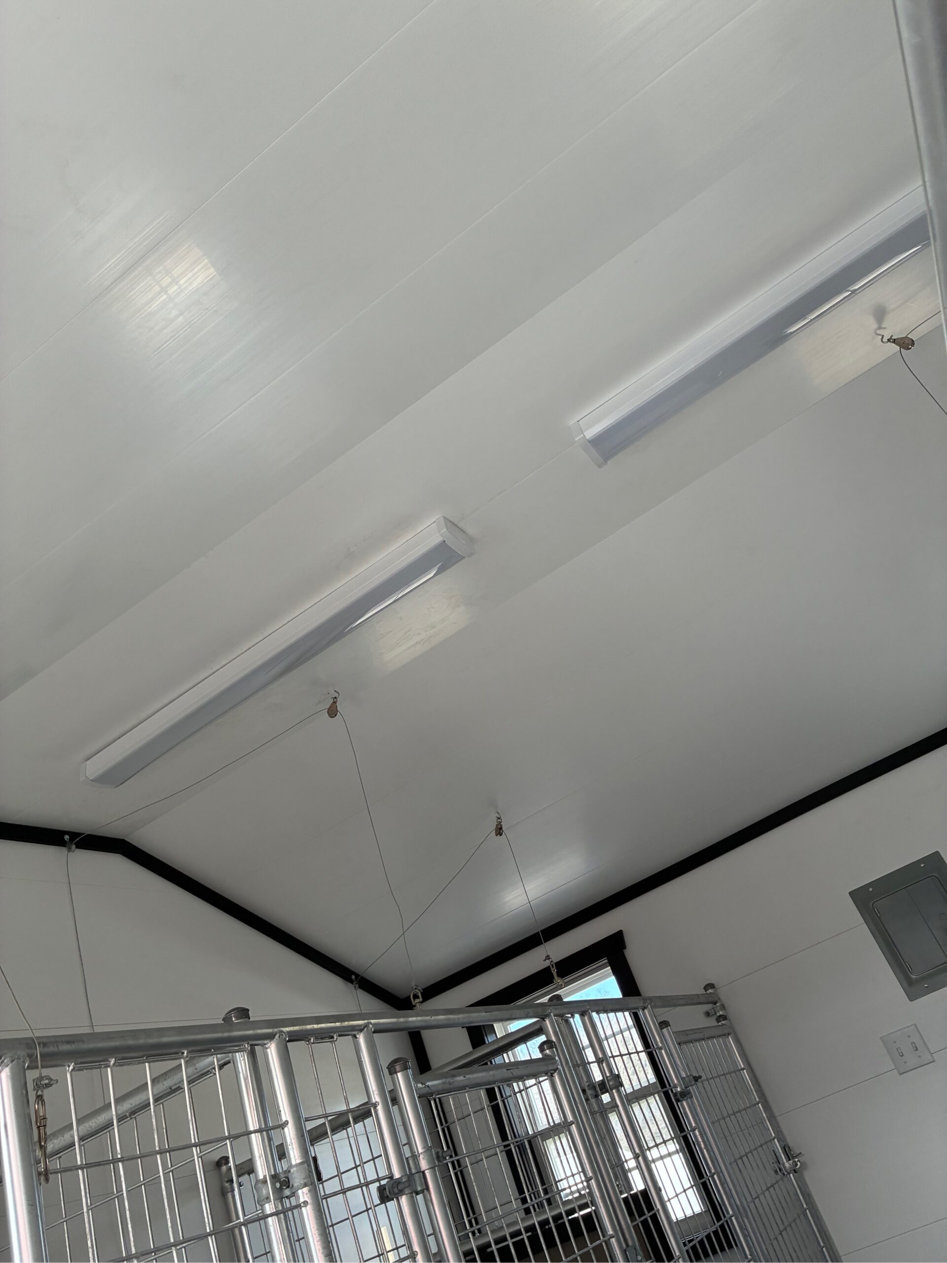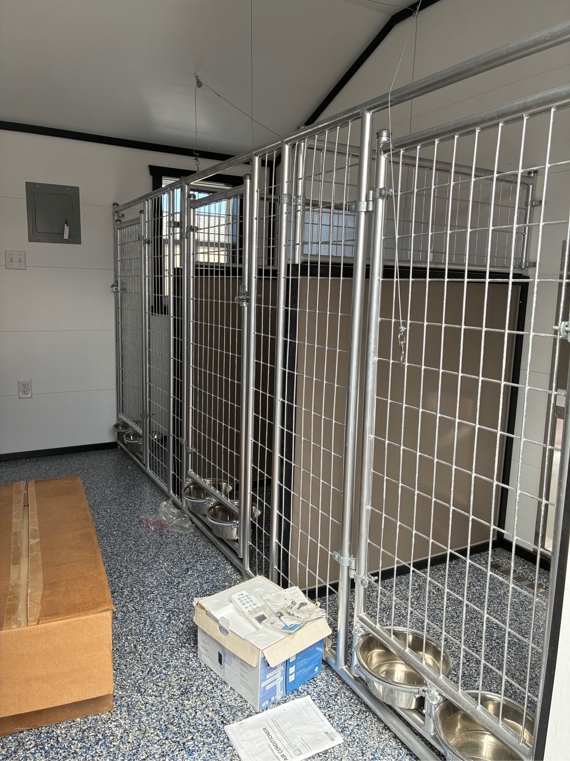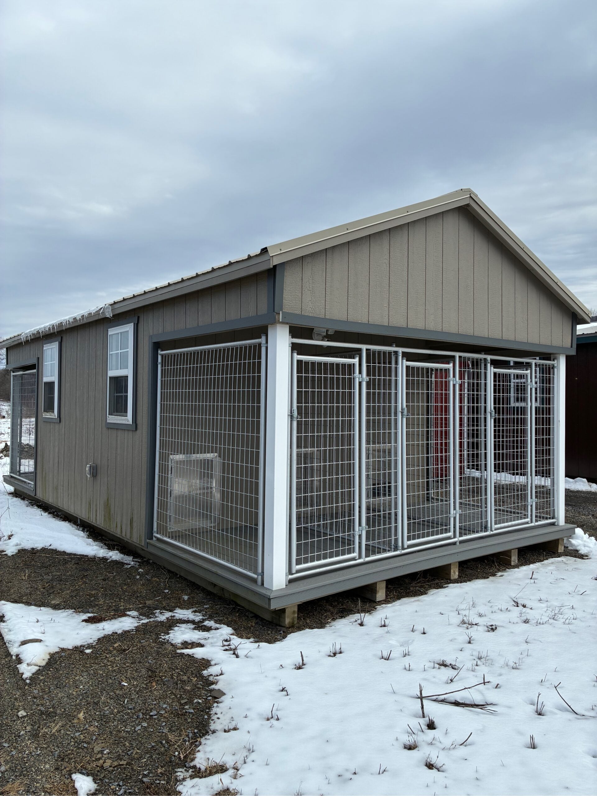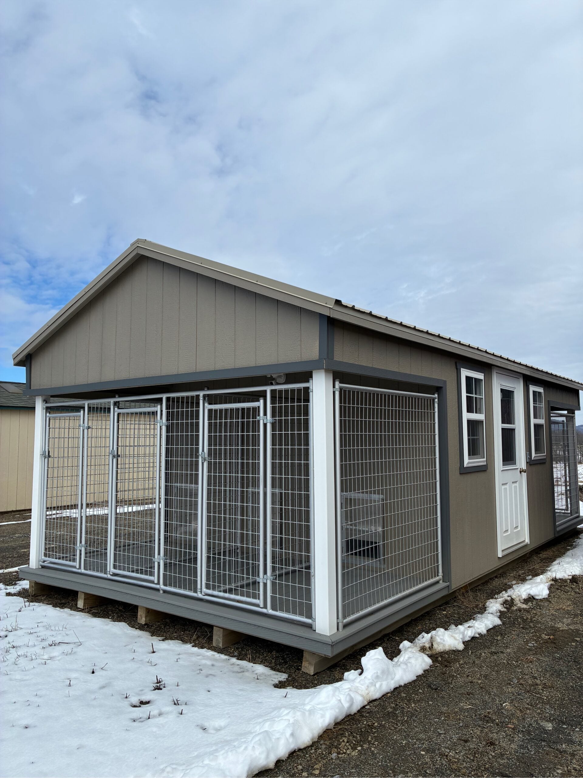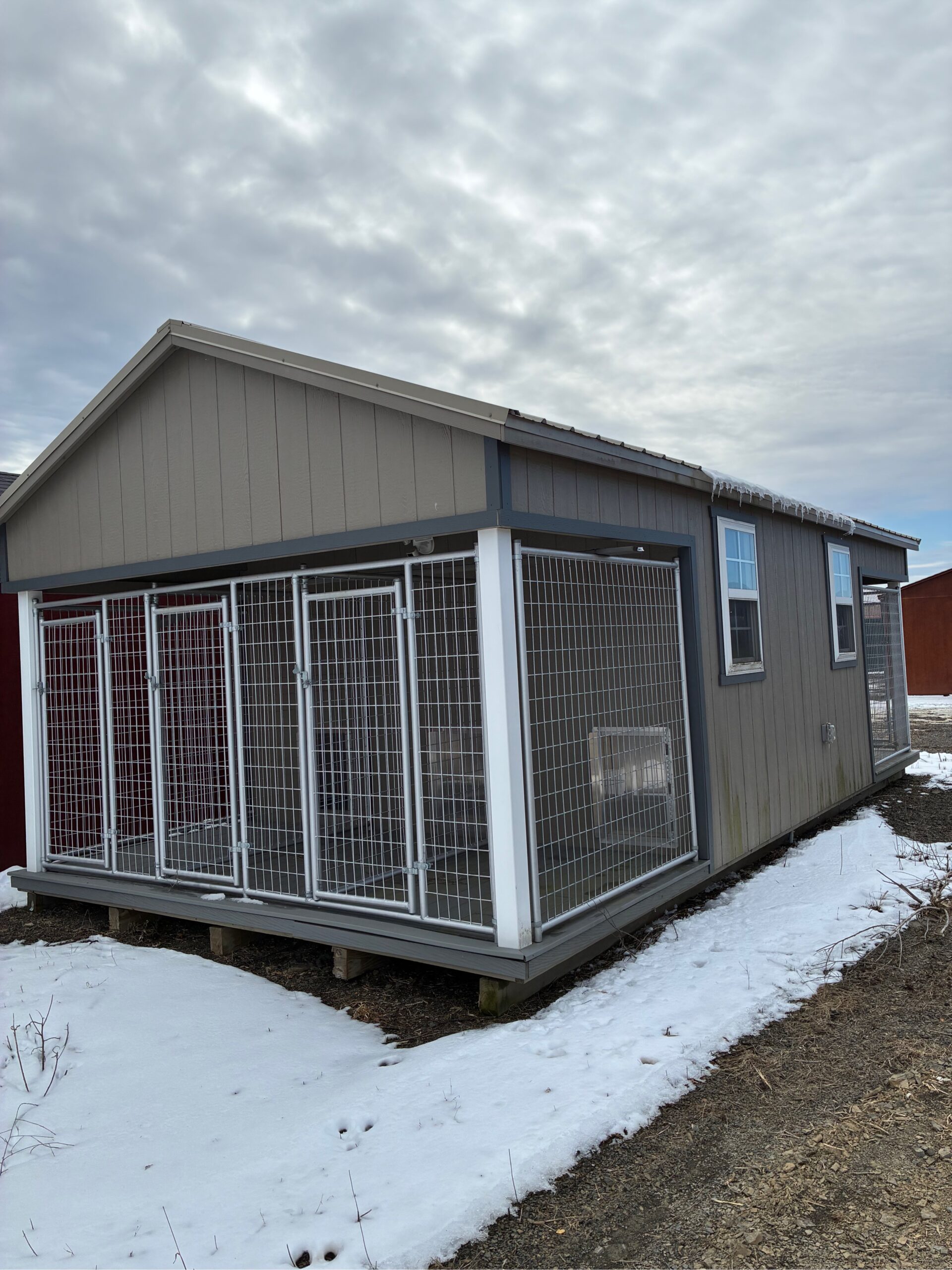 The 12×24 Finished 6-Run Dog Kennel offers secure, comfortable housing for up to six dogs. Featuring clay and dark gray siding, a durable desert metal roof, four insulated 24×36 windows, a prehung entry door, and full electrical setup, this kennel is built for convenience and year-round use.