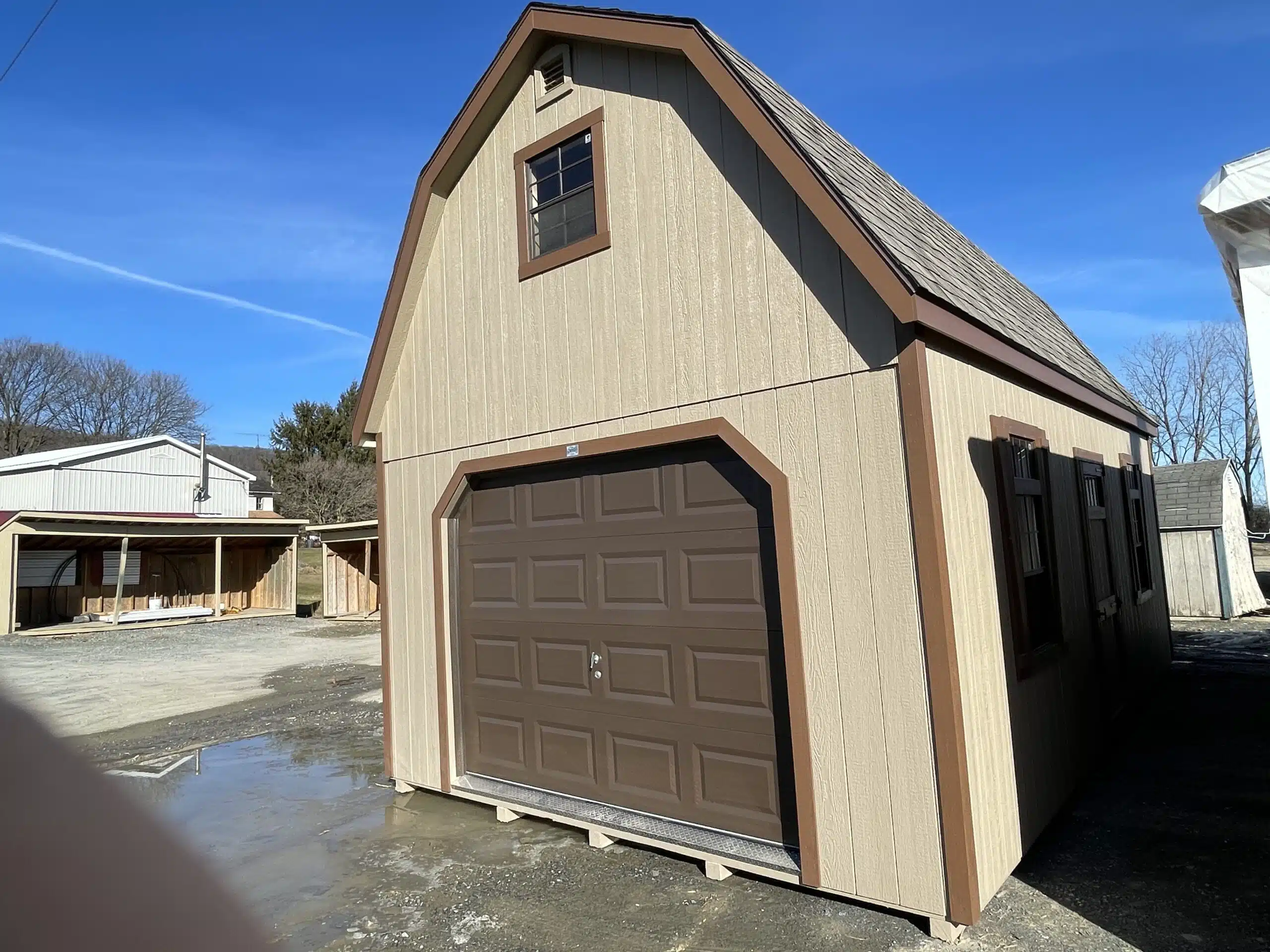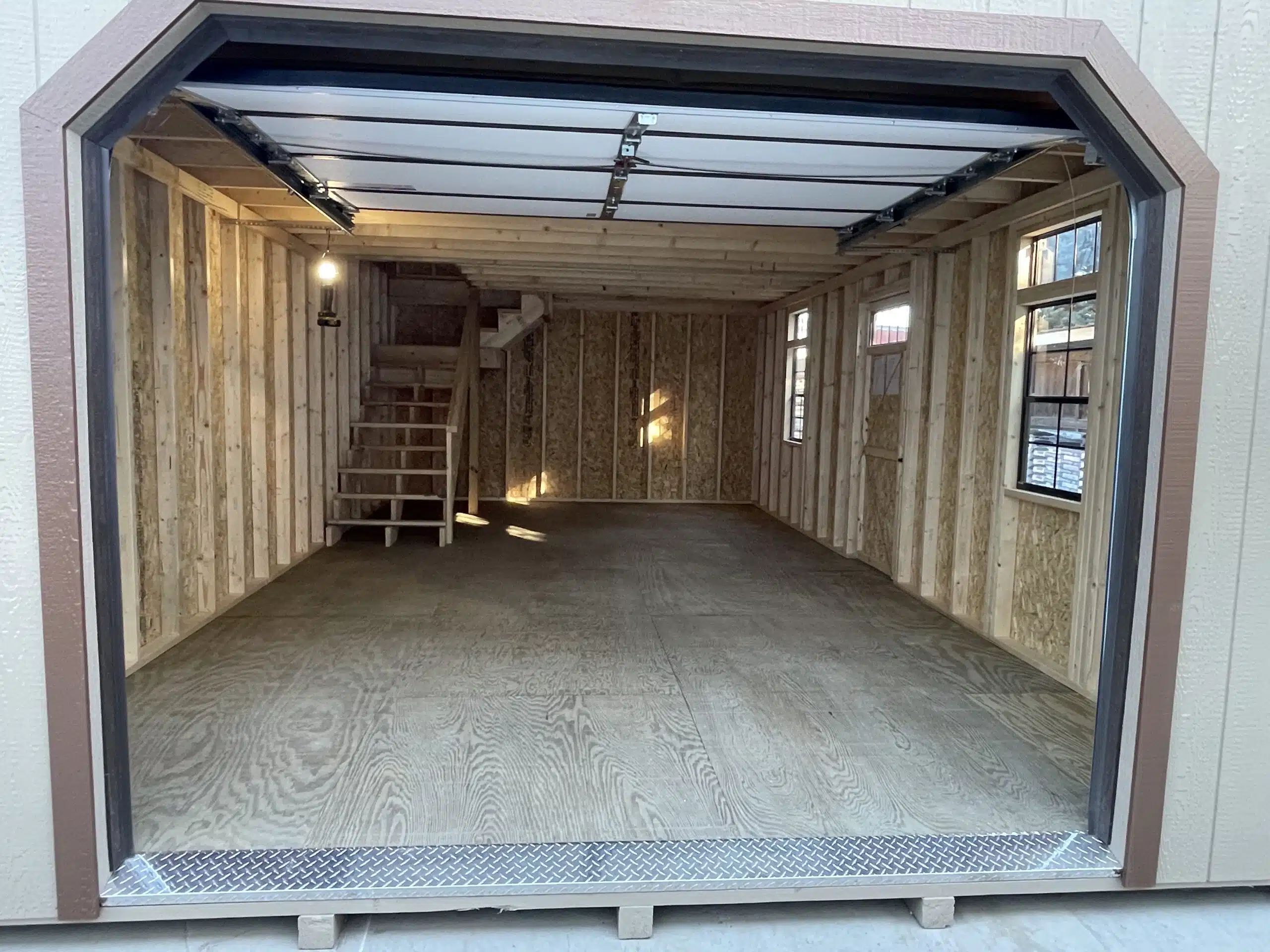 Maximize your storage and workspace with this impressive 14×24 two-story garage, expertly crafted in buckskin with rich chestnut trim and a weatherwood shingled roof for a timeless look. The main level offers a wide 9×7 brown garage door with tread plate entry for easy vehicle access, plus a convenient 3′ single door for daily entry. Four windows—two on the ground floor and two on the upper level—fill the space with natural light, making it perfect for automotive projects, a workshop, or organized storage.