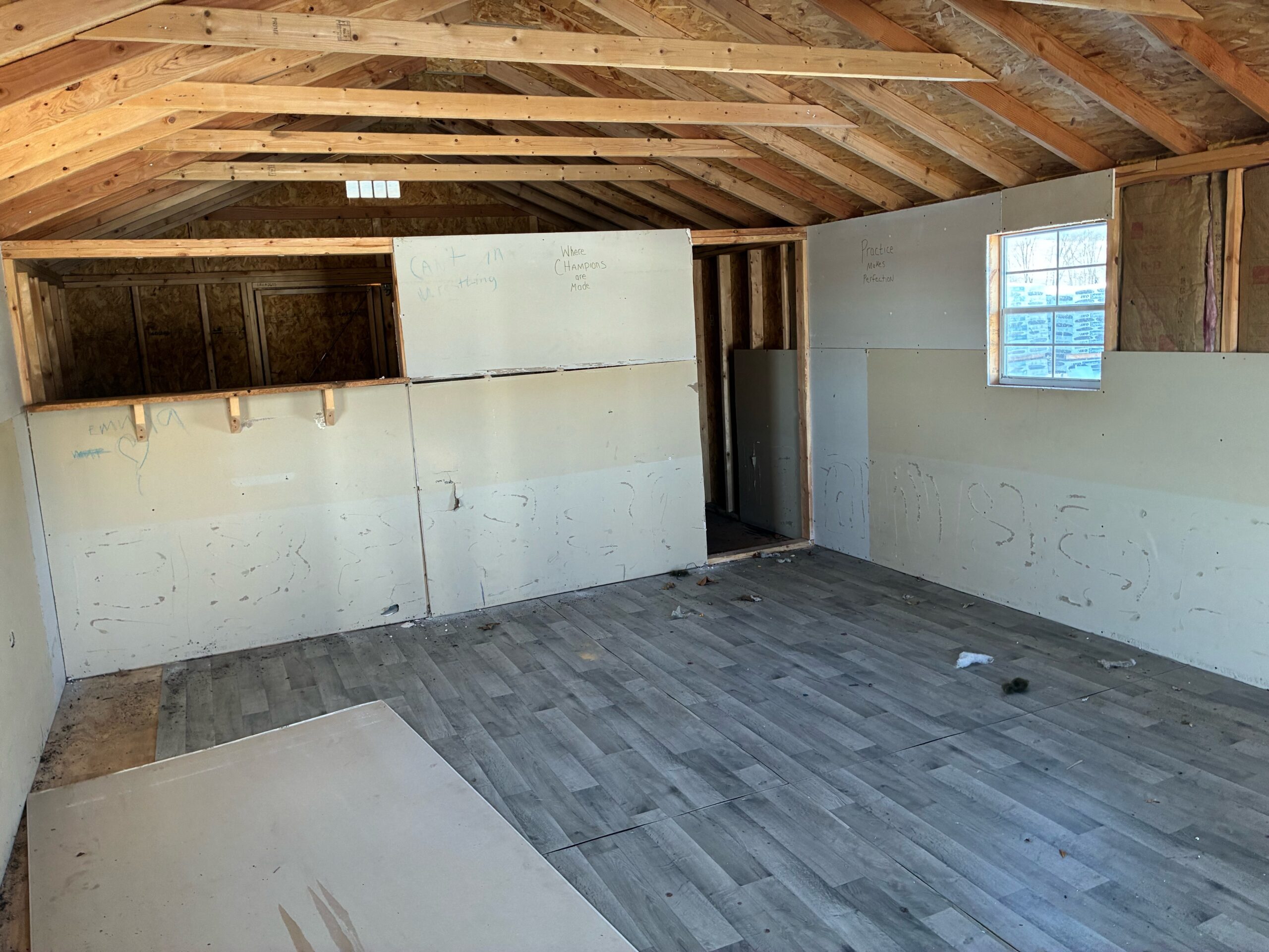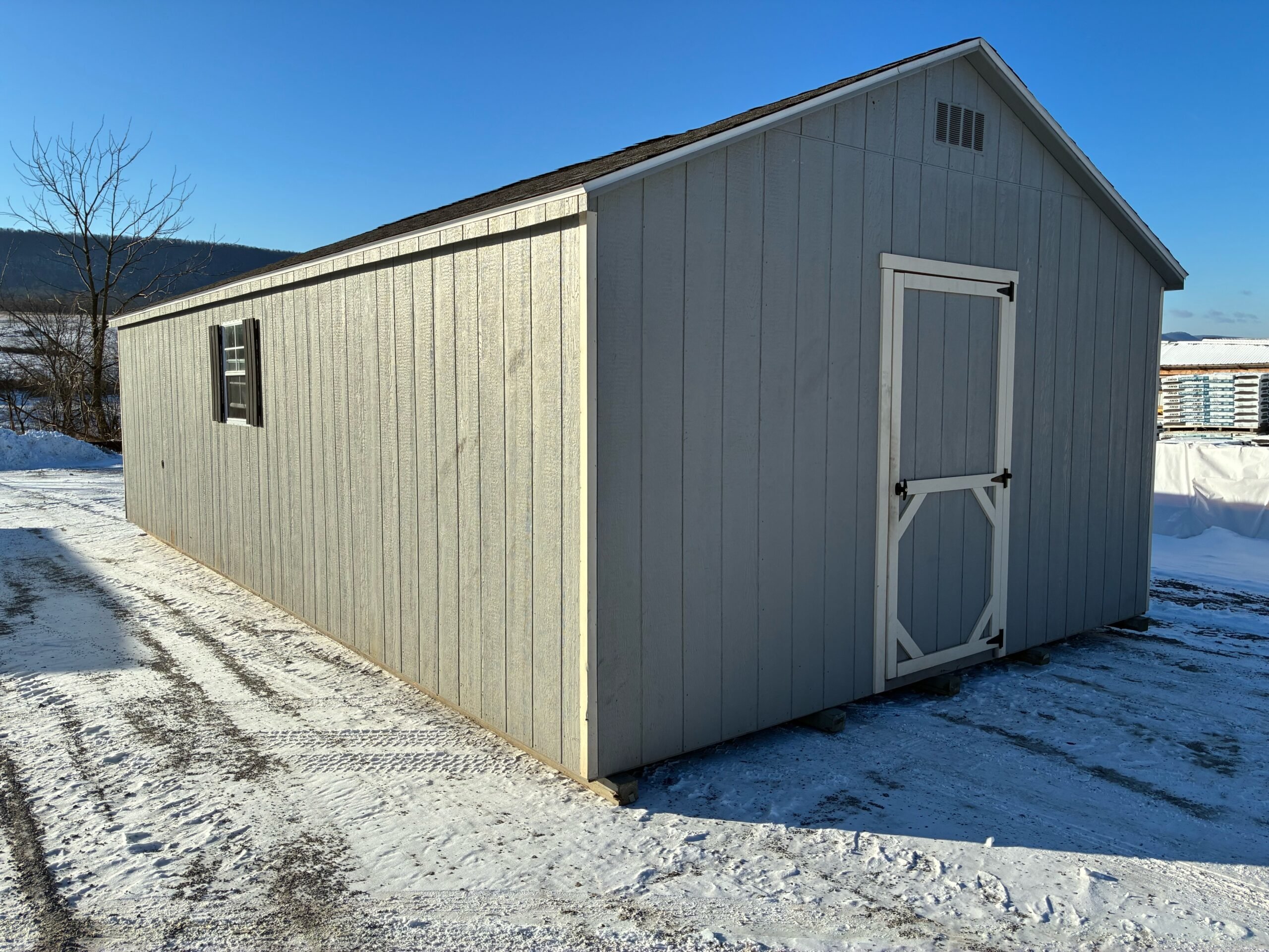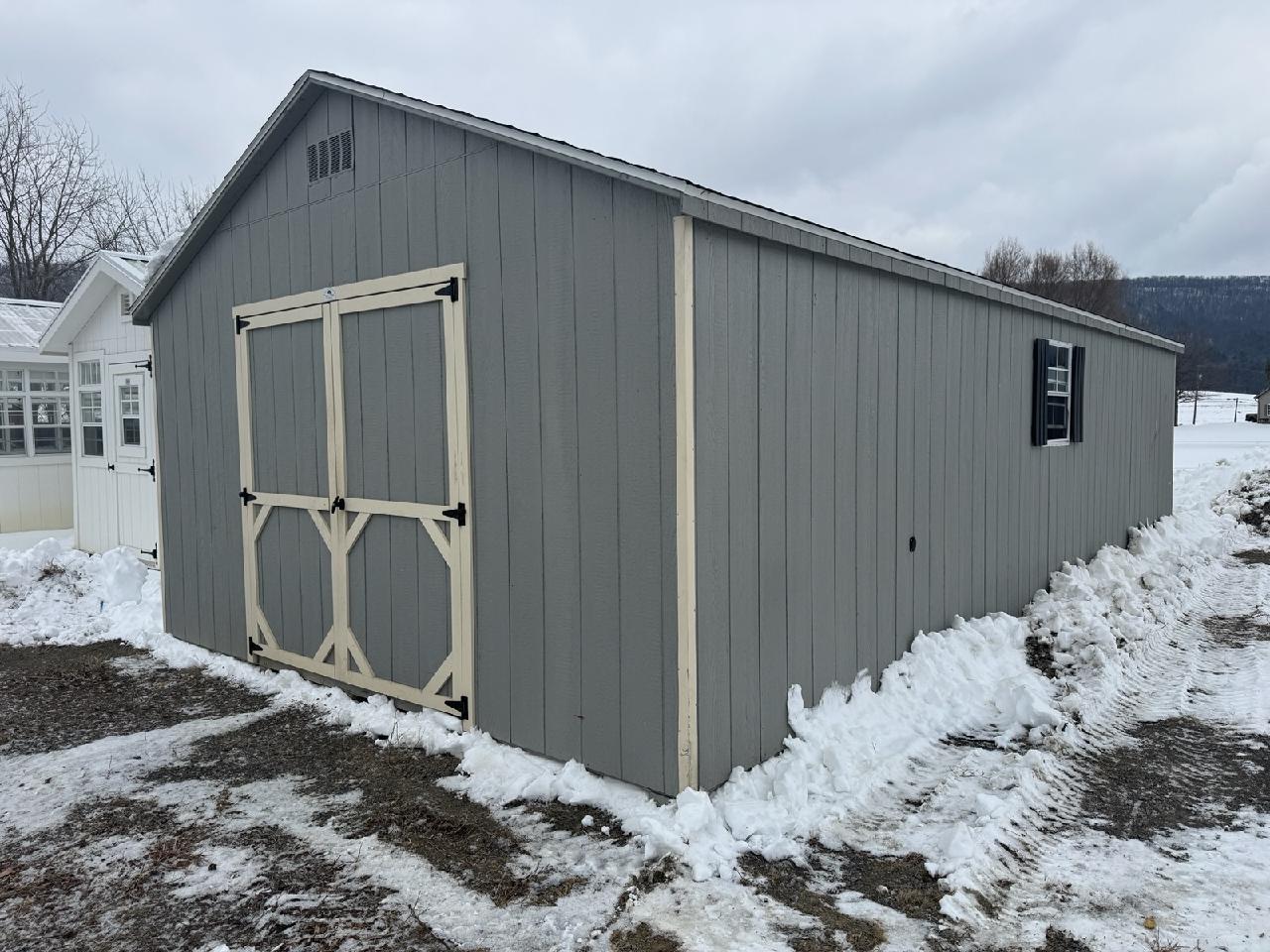 This 14×28 A-Frame storage shed boasts a gap gray Smartside exterior with almond trim and a charcoal gray architectural shingle roof. Features include a wide 6×6 double door for easy access, a 36″ side entry door, and two 24×27 windows with black shutters for natural light and style. The ridge vent ensures excellent airflow, making this shed a practical and attractive solution for storing equipment, tools, or seasonal items.
