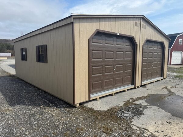 The 24×24 Double Garage is built to provide dependable storage space and convenient access for a variety of needs. Featuring buckskin siding, brown trim, and a weatherwood roof, this model offers a clean, traditional look that fits well on many properties.