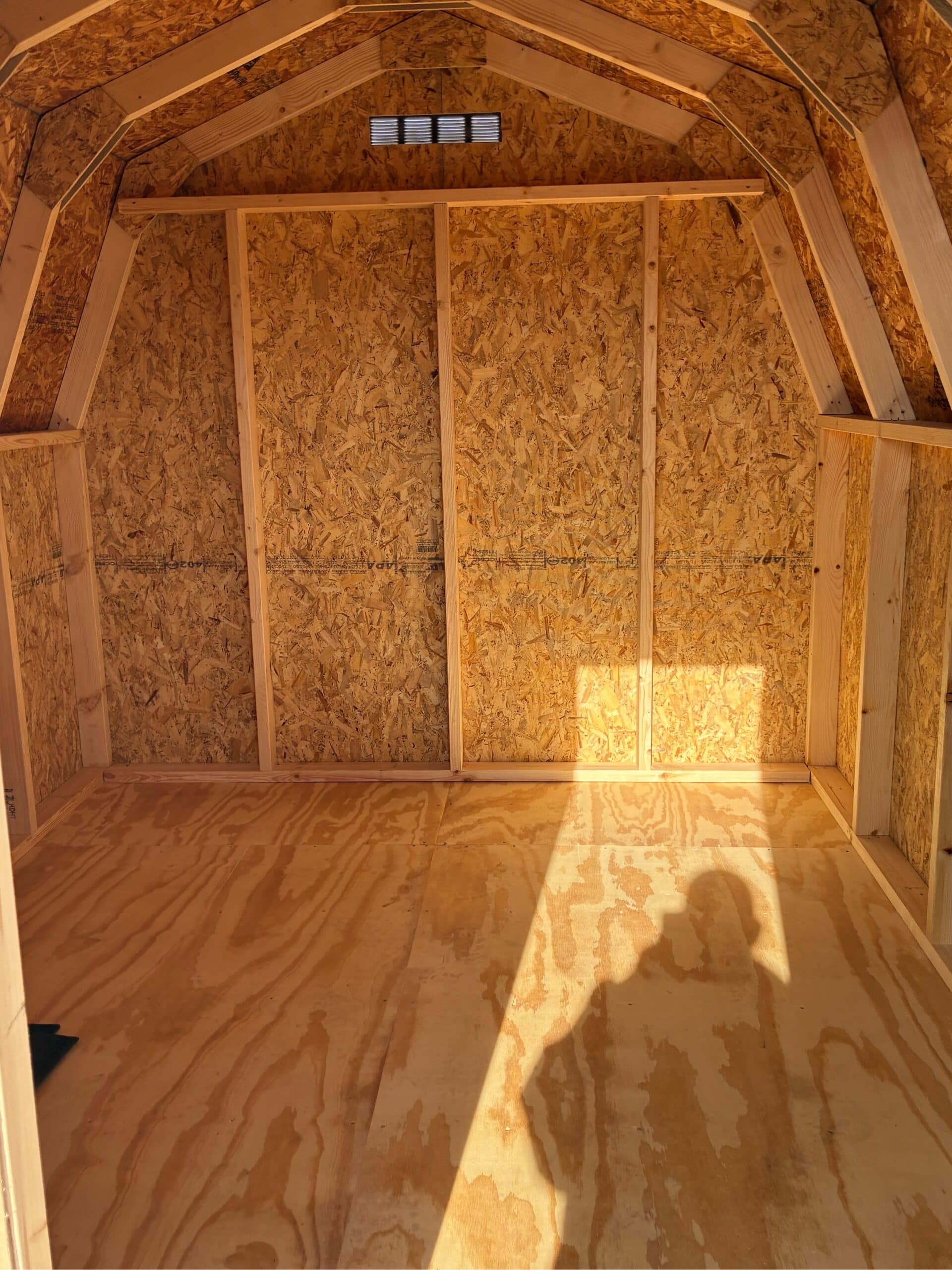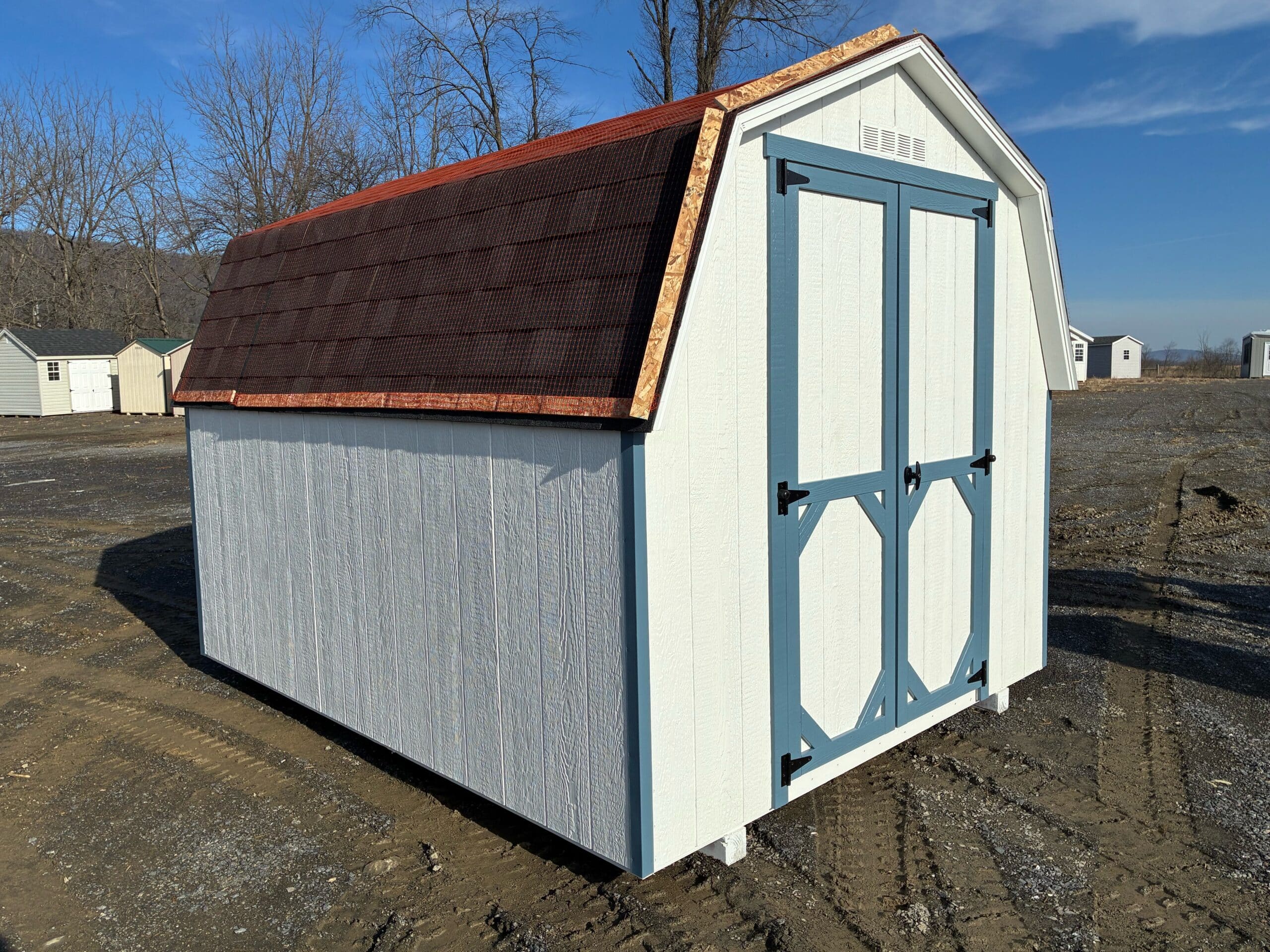 The 8×10 Carolina Mini Barn, Model 2037S, brings classic style and efficient storage to your backyard. Constructed with durable white Smartside siding and accented by Riehl blue trim, this mini barn stands out with its charming color combination and robust craftsmanship. The black shingled roof ensures lasting protection from the elements, while the 4ft double door with black hardware makes it easy to store and retrieve lawn equipment, bikes, or seasonal items. The mini Dutch barn roofline maximizes vertical storage space inside, making the most of its compact footprint. Perfect for homeowners looking for a practical and attractive storage solution that fits smaller spaces.