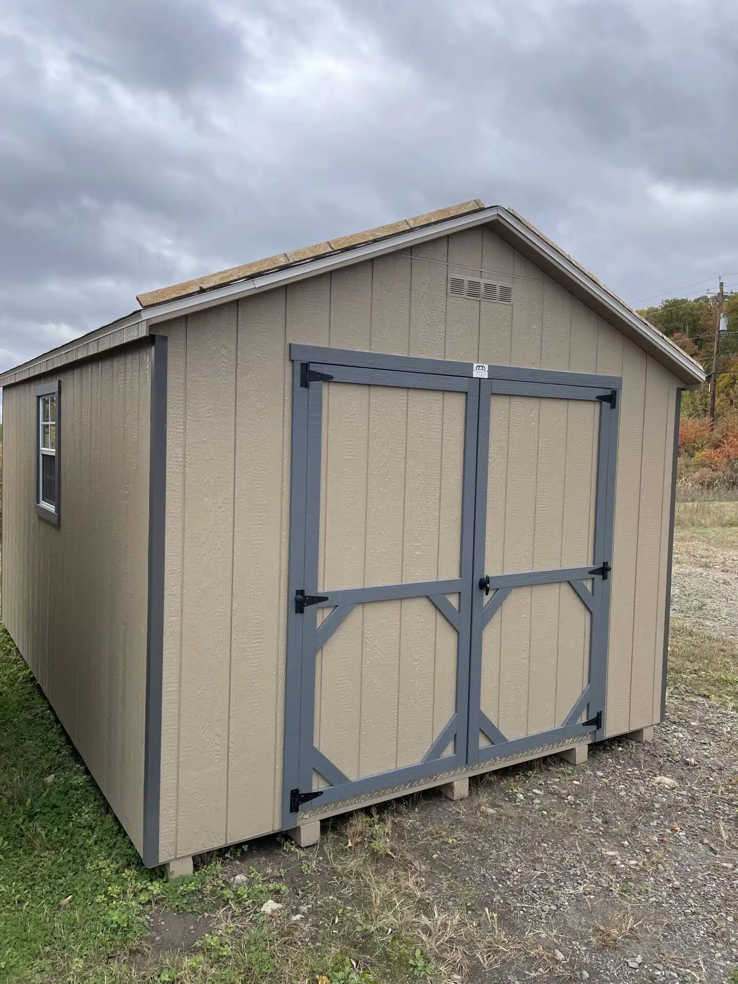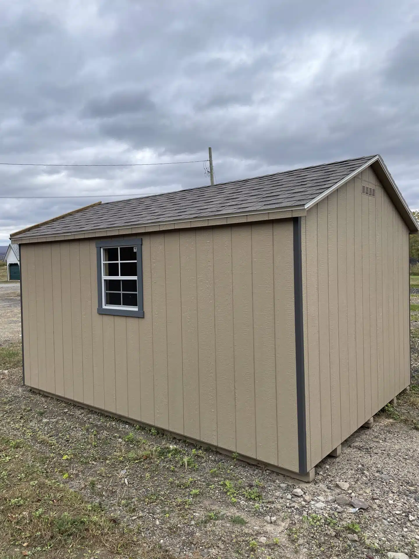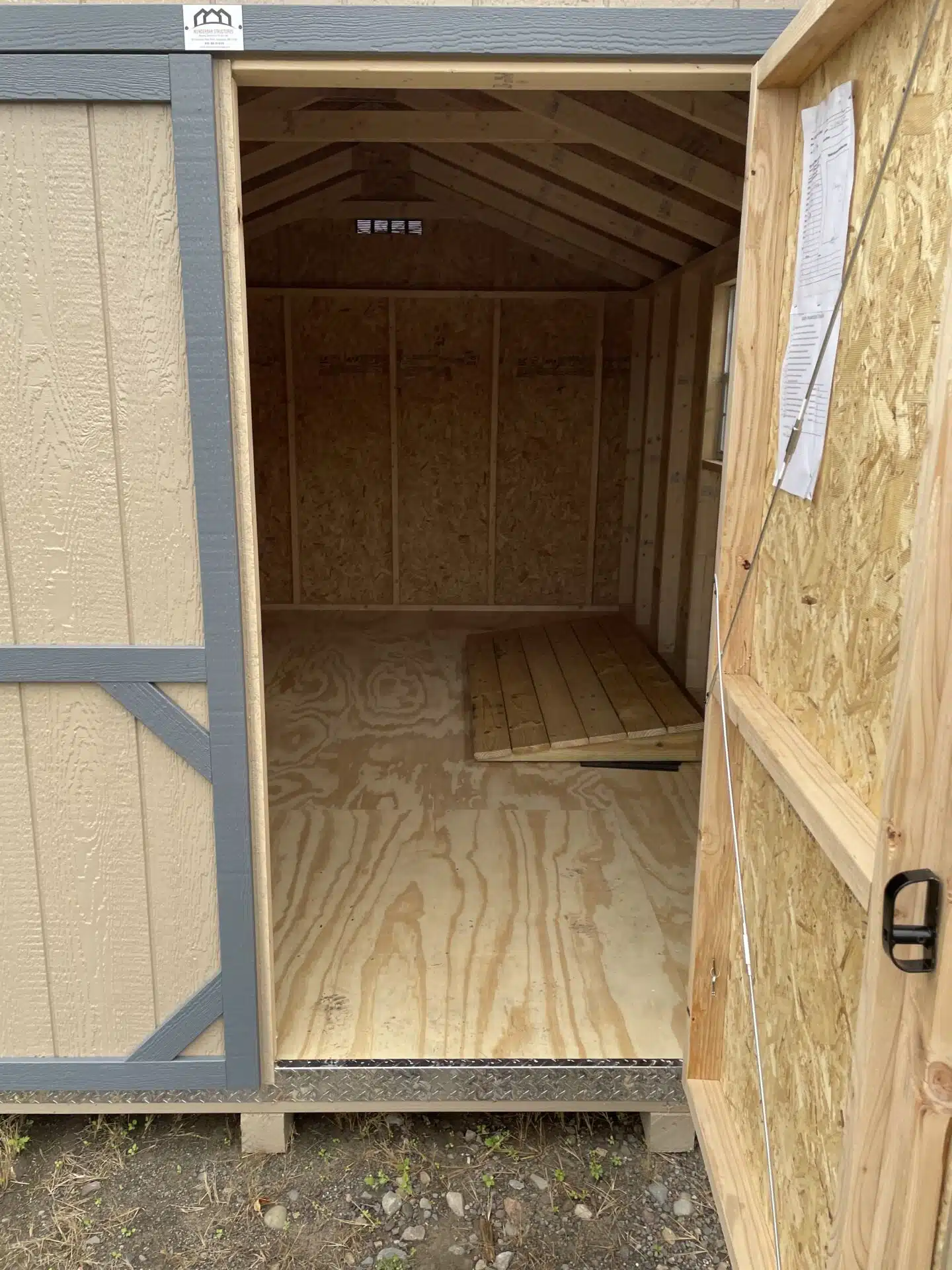 Bring charm and versatility to your property with the 10×16 Carolina Cottage, Model 1366-02. Finished in stylish Gap Gray with blue gray trim and a charcoal roof, this cottage-style shed features a 6×6 transom overhead door for easy access and extra natural light, a 9-lite entry door, and two 24×27 windows with matching trim. End vents provide ventilation, while the 6-foot ramp ensures smooth entry for mowers, tools, or equipment. The open, unfinished interior offers ample space for storage, a workshop, or a creative backyard retreat—blending classic design with modern utility.