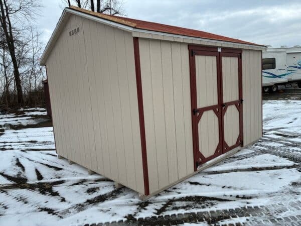 10×12 Carolina A-Frame shed with GP Tan Smartside siding, red trim, 3-tab aged redwood shingles, and 5ft double doors—durable, stylish, and perfect for storage.