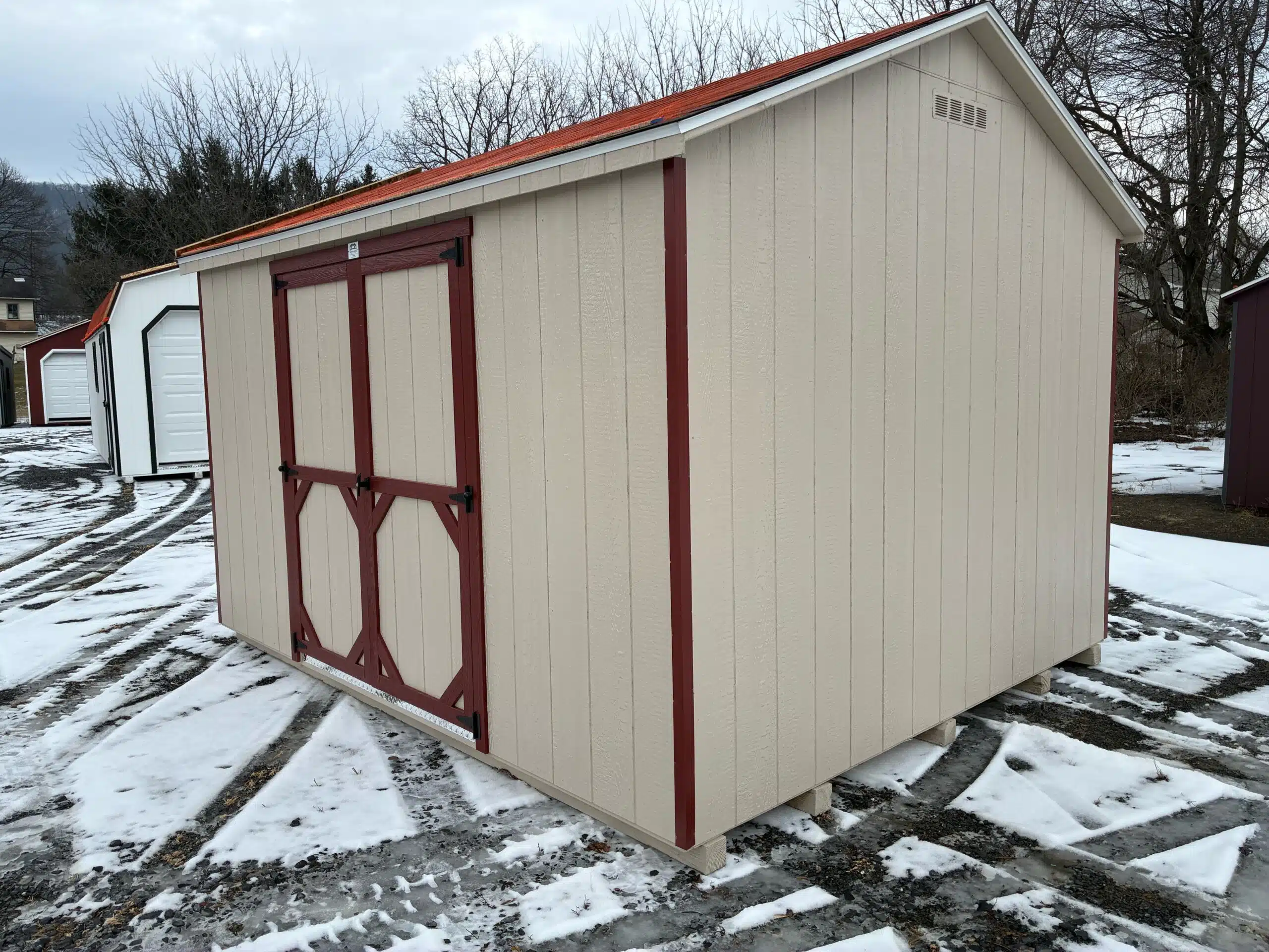 The 10×12 Carolina A-Frame shed, Model 2029S, is a versatile and attractive storage solution for any property. Built with durable GP Tan Smartside siding and accented by bold red trim, this shed features a classic A-frame roof with 3-tab aged redwood shingles for long-lasting protection. The wide 5ft double door with tread plate allows easy access for larger items, while the spacious interior with sturdy plywood flooring and vented design ensures your belongings stay safe and dry. Ideal for storing tools, garden equipment, or seasonal items, this shed combines quality craftsmanship with timeless curb appeal and practical functionality.