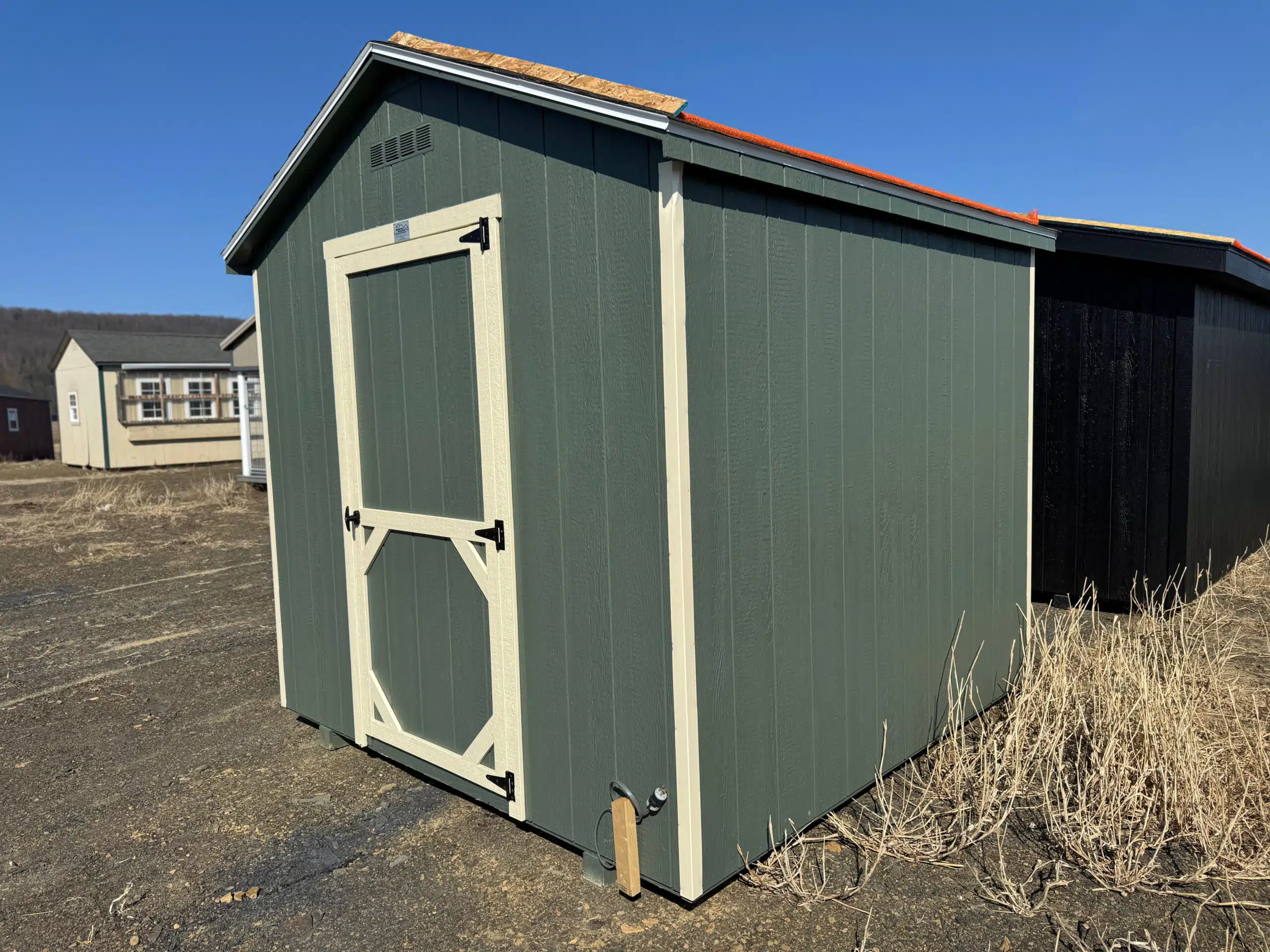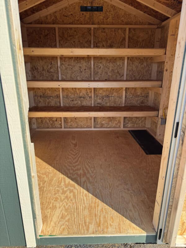 Upgrade your outdoor space with the versatile 8×8 Carolina A Frame shed, model 2015S. Finished in eye-catching avocado green with crisp cream trim and a weatherwood roof, this shed combines timeless style with practical features. The 3′ single entry door and 18×23 window provide easy access and natural light, while the spacious interior is equipped with three built-in shelves for efficient storage of tools, supplies, or seasonal items.
