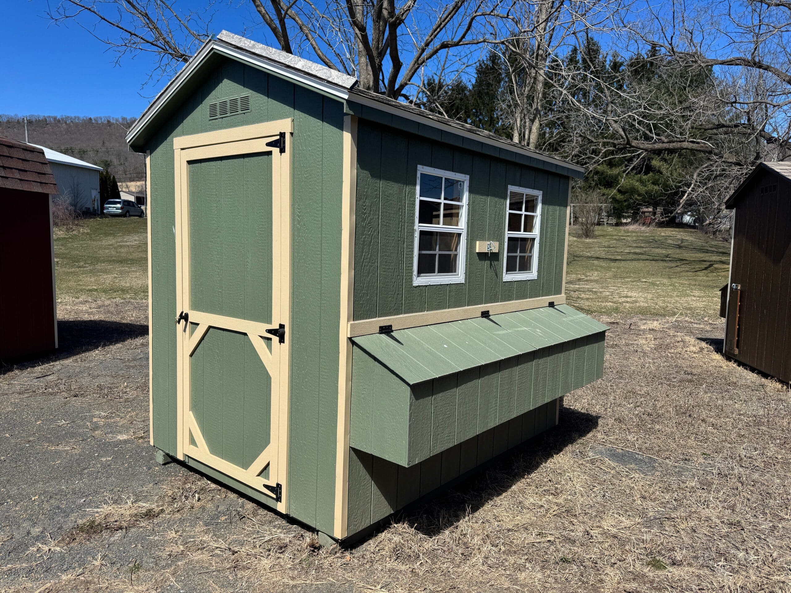 6×8 chicken coop in Pequea Green with cream trim and weatherwood roof, featuring double windows, exterior nesting box, roosting bars, and vent—ideal for a happy, healthy backyard flock.