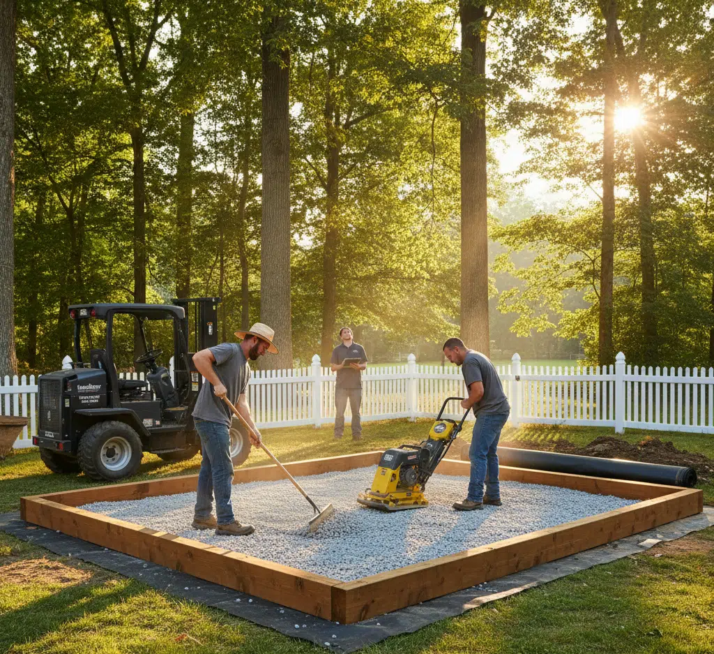 Framing and Stone Filling: We construct a 4×6 framed area on the prepared site. This frame is then filled with 4 to 6 inches of clean stone. The stone is meticulously leveled and compacted to create a solid base.